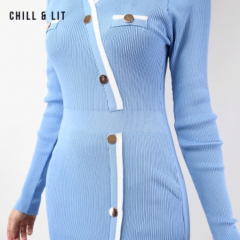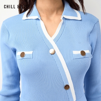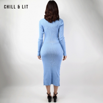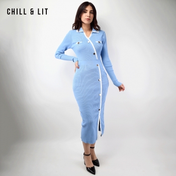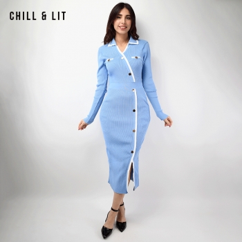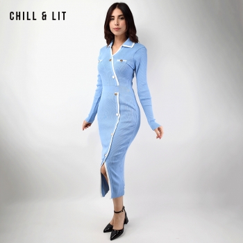 Robe Longue En Laine avec Effet de Cote de Style Old Money. Robe Ajustable Avec Manches Longues et Col Chemise avec Boutons Inoxydables Hyper Tendances.