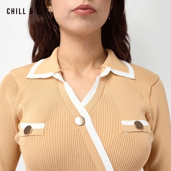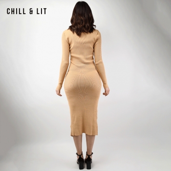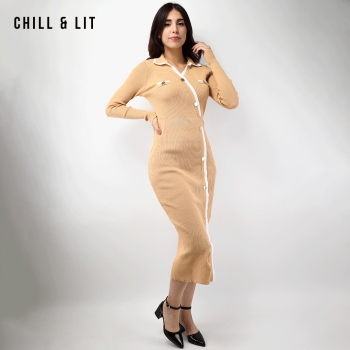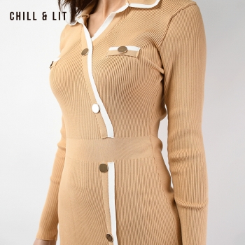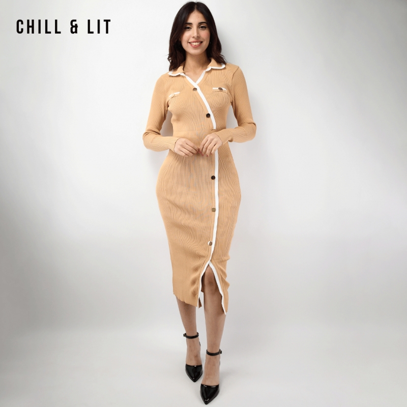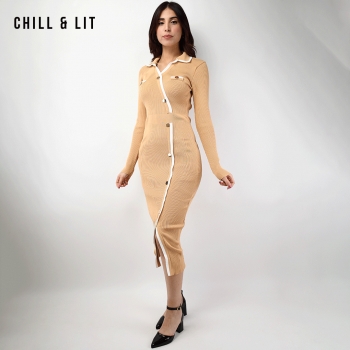 Robe Longue En Laine avec Effet de Cote de Style Old Money. Robe Ajustable Avec Manches Longues et Col Chemise avec Boutons Inoxydables Hyper Tendances.