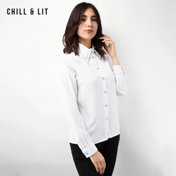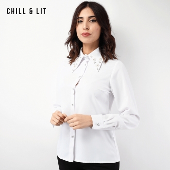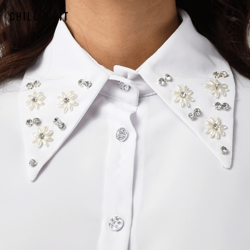 Chemise Femme Avec Col en Strass, Manches longues. Très Tendance en Ce Moment. Le Mannequin Porte La Taille 38. Le Mannequin Mesure 1m78.