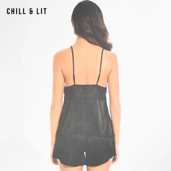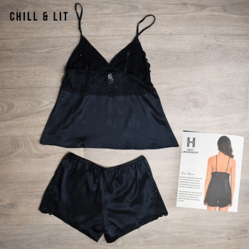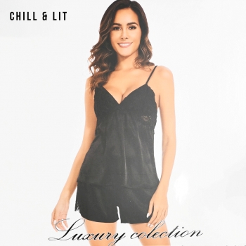 Ensemble de Nuit Deux Pièces élégant et Confortable, Composé d’un Pull à fines bretelles et d’un short assorti. Confectionné dans une matière satinée douce et légère, il offre une Sensation Agréable sur la Peau tout en assurant un Tombé Fluide