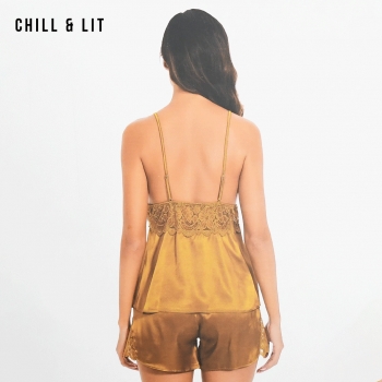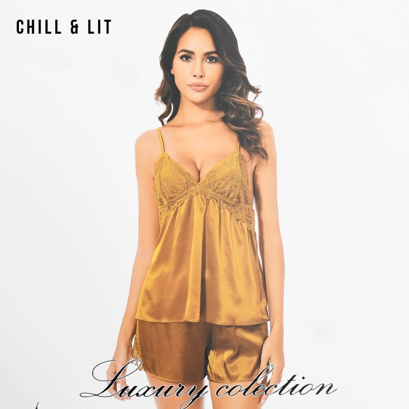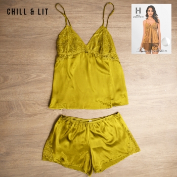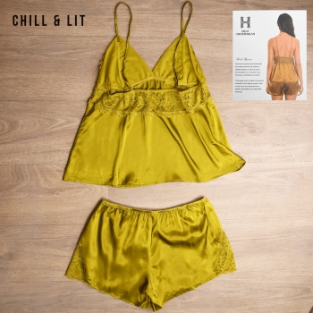 Ensemble de Nuit Deux Pièces élégant et Confortable, Composé d’un Pull à fines bretelles et d’un short assorti. Confectionné dans une matière satinée douce et légère, il offre une Sensation Agréable sur la Peau tout en assurant un Tombé Fluide