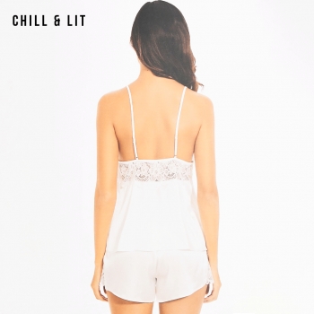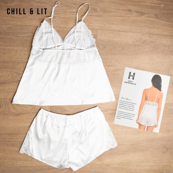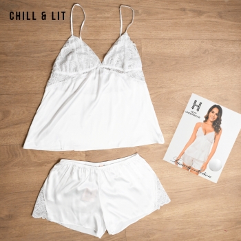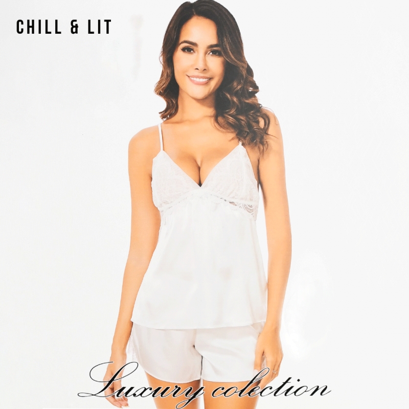 Ensemble de Nuit Deux Pièces élégant et Confortable, Composé d’un Pull à fines bretelles et d’un short assorti. Confectionné dans une matière satinée douce et légère, il offre une Sensation Agréable sur la Peau tout en assurant un Tombé Fluide