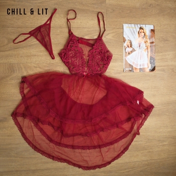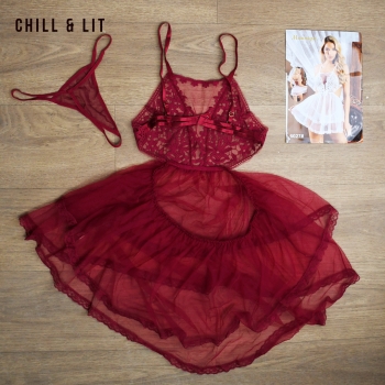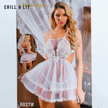 Nuisette élégante en dentelle et tulle, ornée de fleurs en relief sur le buste et à l’ourlet, avec slip assorti. Dotée de fines bretelles et d’une coupe fluide, elle offre un look doux et romantique.