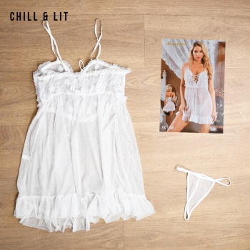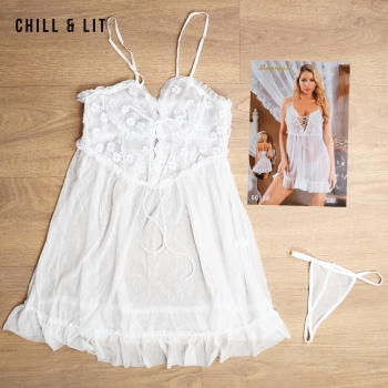 Nuisette élégante en dentelle et tulle, ornée de fleurs en relief sur le buste et à l’ourlet, avec slip assorti. Dotée de fines bretelles et d’une coupe fluide, elle offre un look doux et romantique.