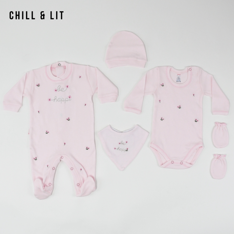 Kit Naissance Sortie Clinique 5 Pieces Body + Grenouillère + Bavoir + chaussons + Bonnet 100% Coton.