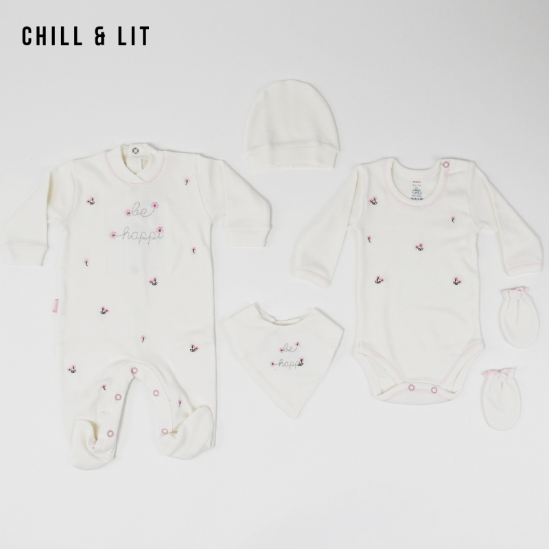 Kit Naissance Sortie Clinique 5 Pieces Body + Grenouillère + Bavoir + chaussons + Bonnet 100% Coton.