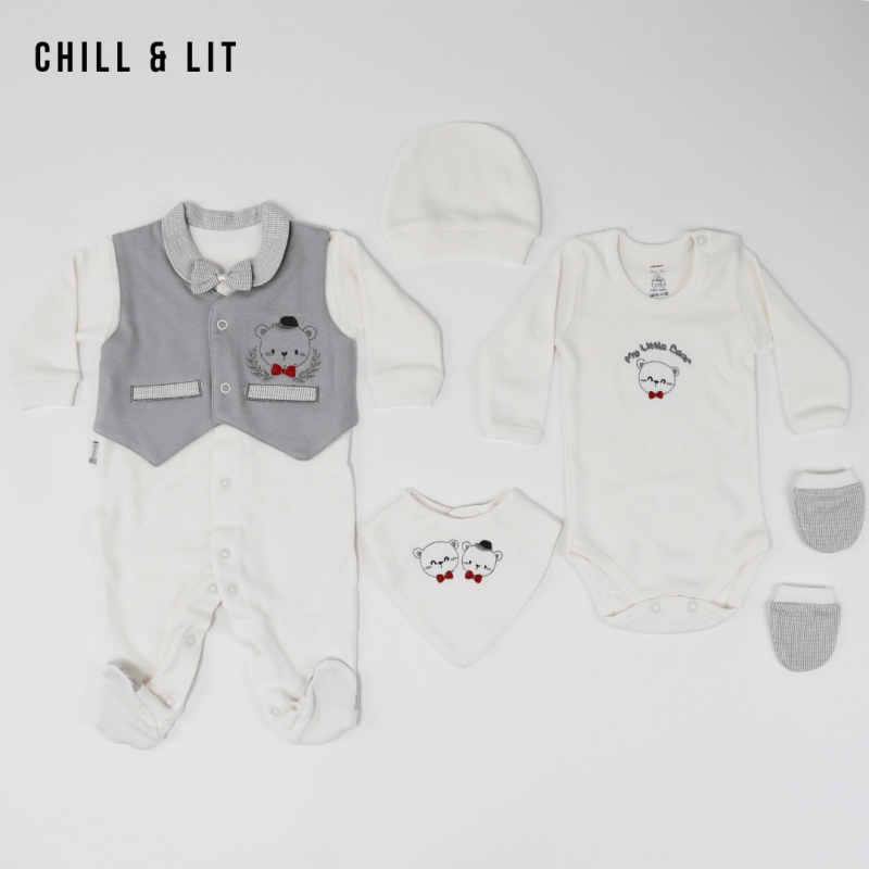 Kit Naissance Sortie Clinique 5 Pieces Body + Grenouillère + Bavoir + chaussons + Bonnet 100% Coton.