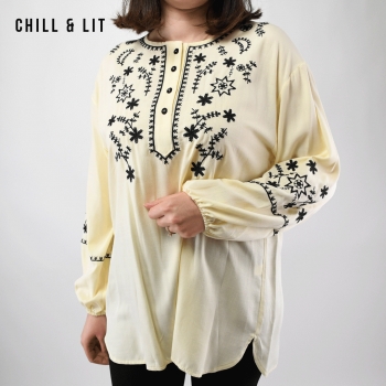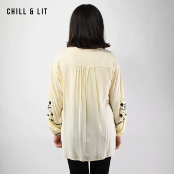 Chemise Femme Manches Longues Brodée Très Tendance en Ce Moment. Le Mannequin Porte La Taille 3. Le Mannequin Mesure 1m78.