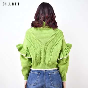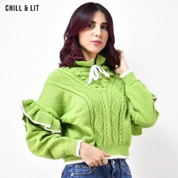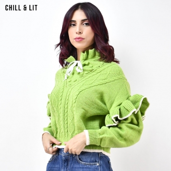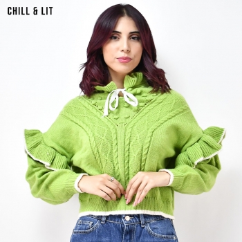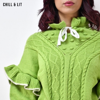 Pull en Laine Femme à Motif Tresse avec Manches Longues à Volants , Col Motant à Volants avec Cordon en Satin Hyper Tendance en ce Moment. Le Mannequin Porte La Taille Standard.