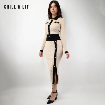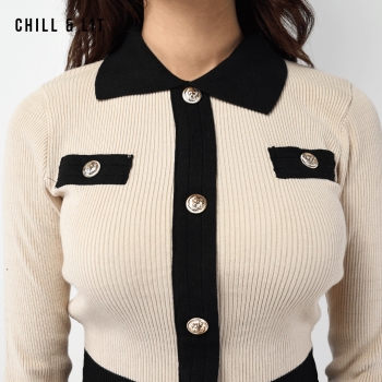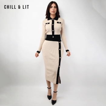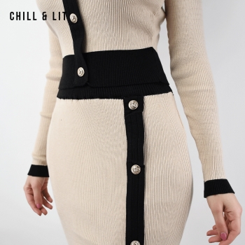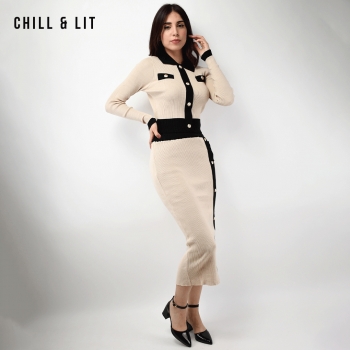 Ensemble en Laine pour Femme de Style Old Money. Top Ajustable Avec Des Boutons Inoxydables, Col Chemise.Jupe Avec Patte à Fente à Côté Devant et Taille Ajustable par Élastique Super Tendance cet Hiver. Le Mannequin Porte La Taille M et Mesure 1m78.