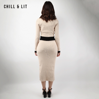Ensemble en Laine pour Femme de Style Old Money. Top Ajustable Avec Des Boutons Inoxydables, Col Chemise + Jupe Avec Patte à Fente à Côté Devant et Taille Ajustable par Élastique Super Tendance cet Hiver. Le Mannequin Porte La Taille M et Mesure 1m78.