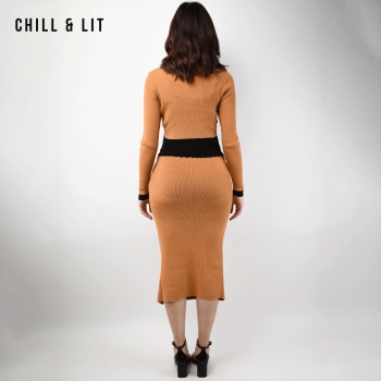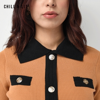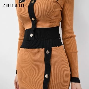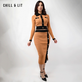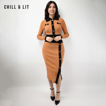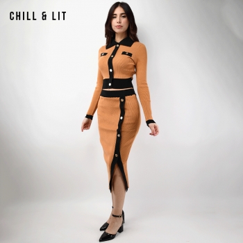 Ensemble en Laine pour Femme de Style Old Money. Top Ajustable Avec Des Boutons Inoxydables, Col Chemise.Jupe Avec Patte à Fente à Côté Devant et Taille Ajustable par Élastique Super Tendance cet Hiver. Le Mannequin Porte La Taille M et Mesure 1m78.