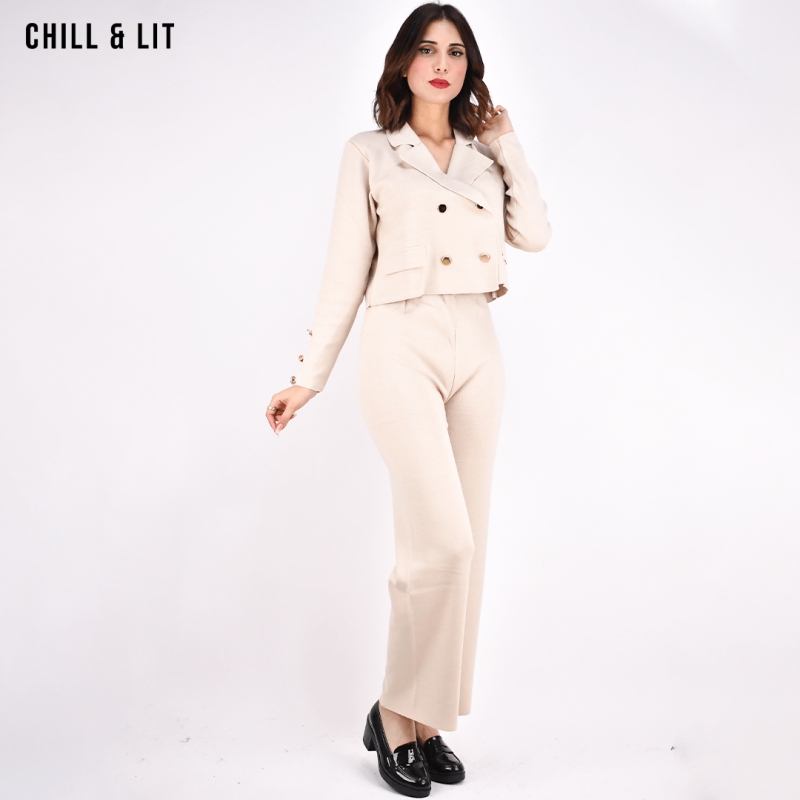 Ensemble en Laine pour Femme. Gilet Veste Courte Oversize Avec Fermeture en Boutons Inoxydables, Col Chemise. Pantalon Large Avec Taille Ajustable par Élastique Hyper Tendances Cet Hiver.