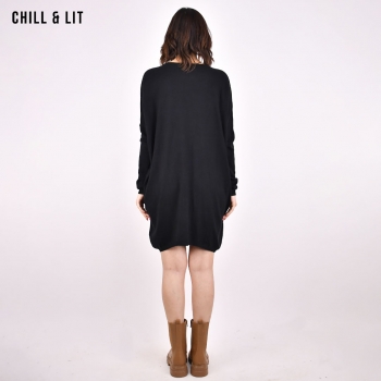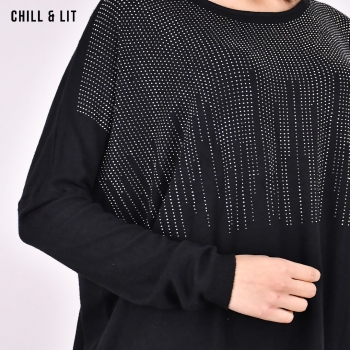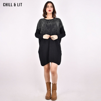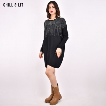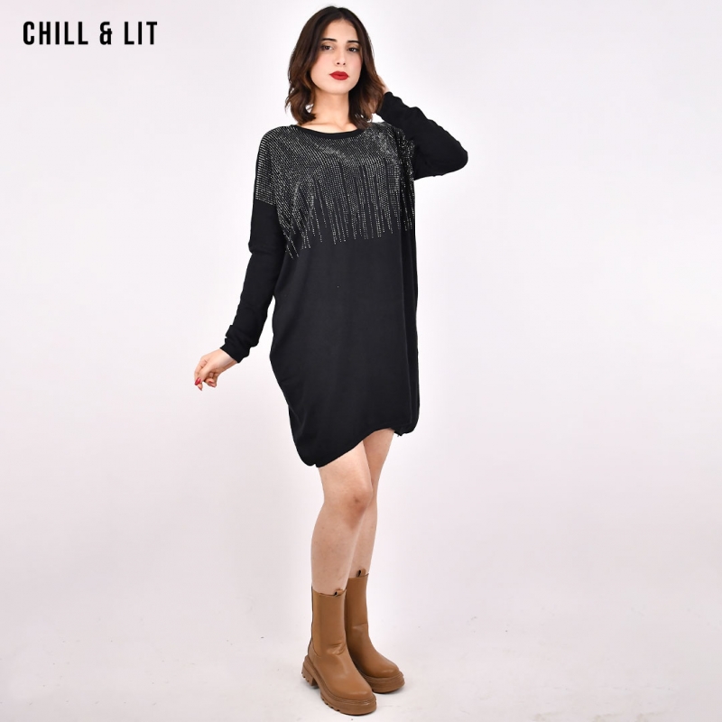 Robe Courte Femme en Laine à Strass, Avec Col Rond, Manches Longues Hyper Tendance en ce Moment. Le Mannequin Porte La Taille Standard.