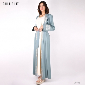 Abaya Femme Longue ses broderies dorées avec Robe sans Manche Super Tendance en ce Moment. Le Mannequin Porte La Taille Standard et Mesure 1m78.