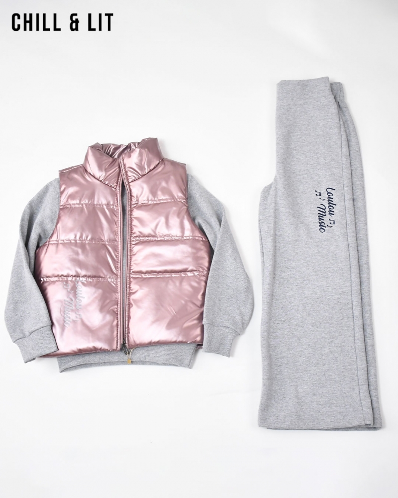 Ensemble Survêtement Fillette 3 pièces avec Doublure Molleton Gratté ,Composé d’une Doudoune Imperméable sans Manches Brillante, d’un sweat à manches longues et d’un pantalon assorti. Confort et style réunis pour un look tendance et décontracté.