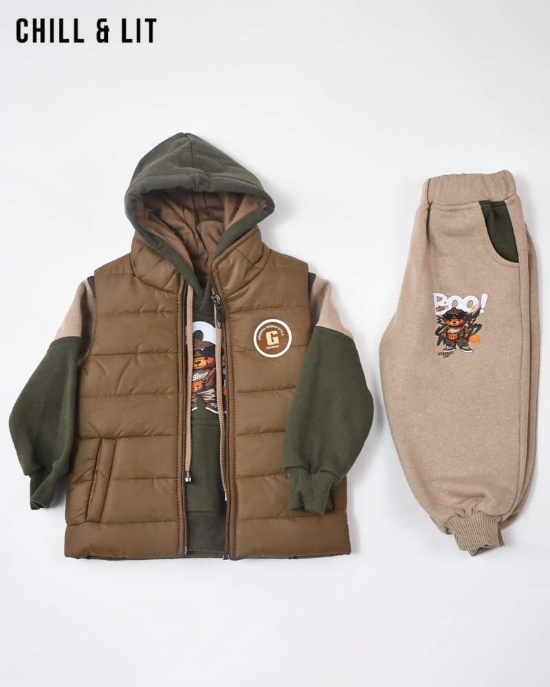 Ensemble 3 pièces garçon composé d’un sweat à capuche imprimé, Doudoune sans manches rembourré et d’un pantalon jogging confortable. Style décontracté et chaud pour l’automne-hiver. L'ensemble sur La Photo est La taille 2ans
