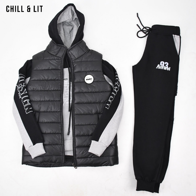 Ensemble 3 pièces garçon composé d’un sweat à capuche imprimé, Doudoune sans manches rembourré et d’un pantalon jogging confortable. Style décontracté et chaud pour l’hiver. L'ensemble sur La Photo est La taille 10ans.