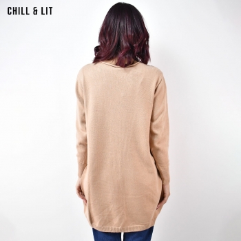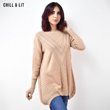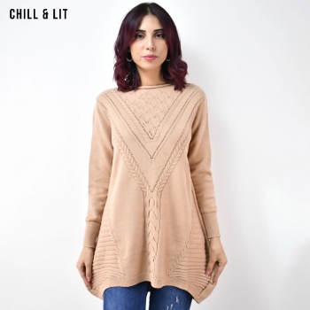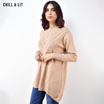 Pull long Femme Col Rond avec une coupe évasée et asymétrique qui offre à la fois confort et style. Le Mannequin Porte La Taille Standard.