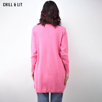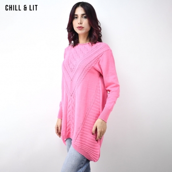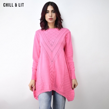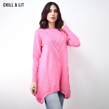 Pull long Femme Col Rond avec une coupe évasée et asymétrique qui offre à la fois confort et style. Le Mannequin Porte La Taille Standard.