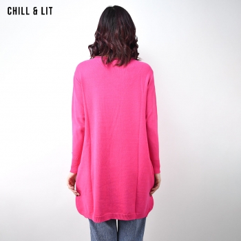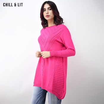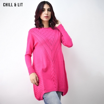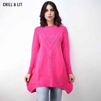 Pull long Femme Col Rond avec une coupe évasée et asymétrique qui offre à la fois confort et style. Le Mannequin Porte La Taille Standard.
