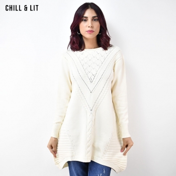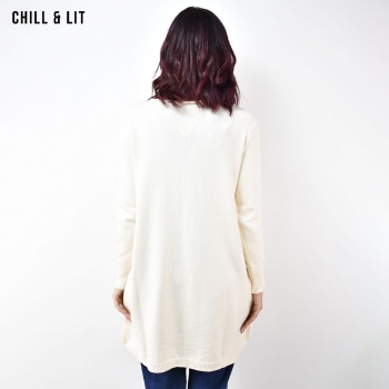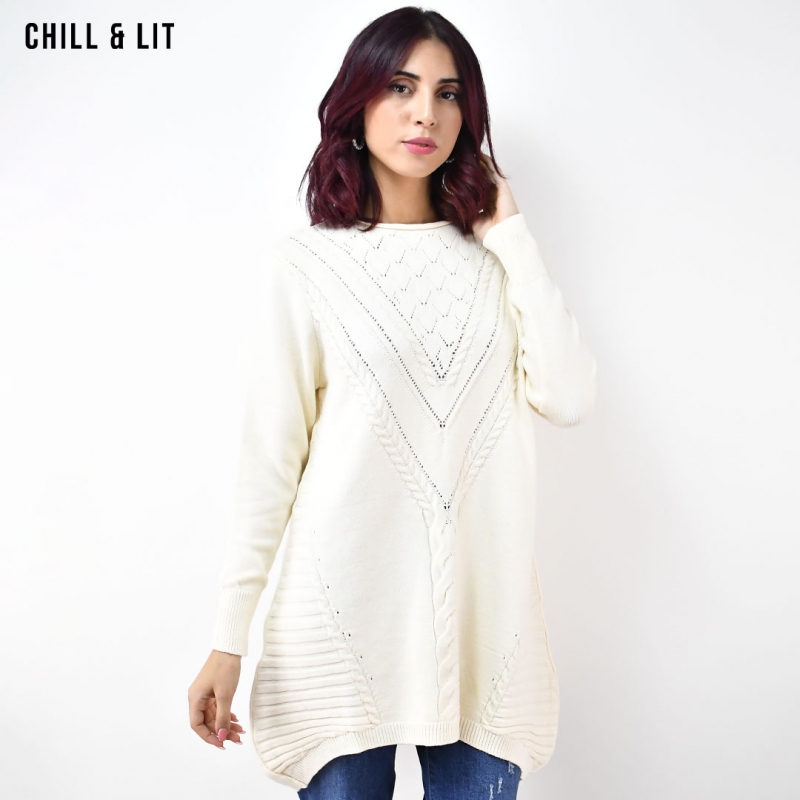 Pull long Femme Col Rond avec une coupe évasée et asymétrique qui offre à la fois confort et style. Le Mannequin Porte La Taille Standard.