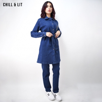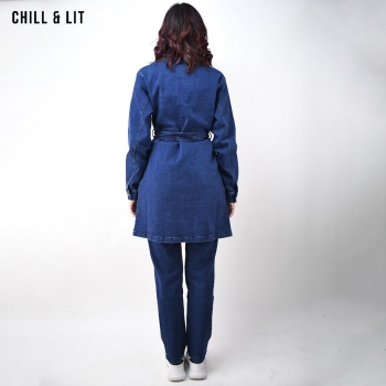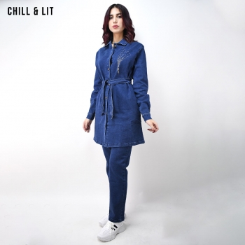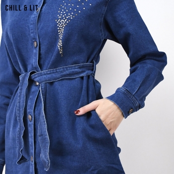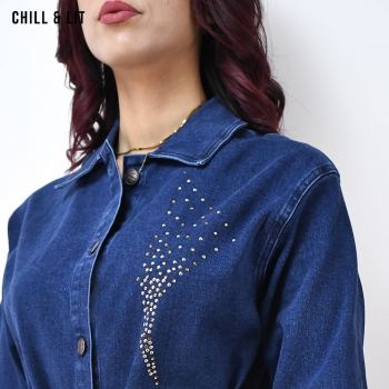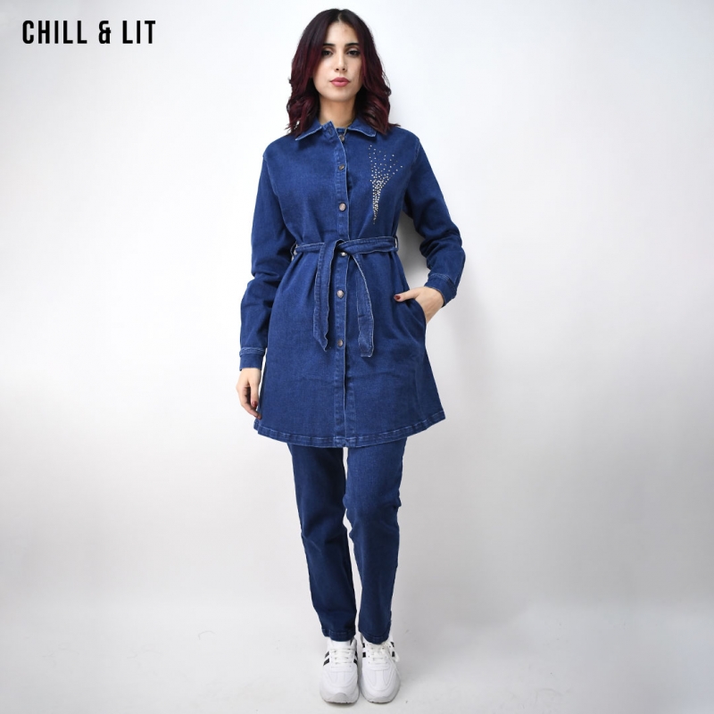 Ensembles Femme Chemise en Jean + Pantalon Jean Taille Haute. Le mannequin porte la taille 40. Le Mannequin Mesure:1m78