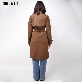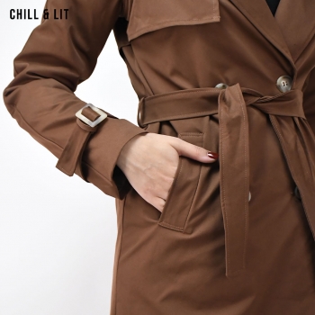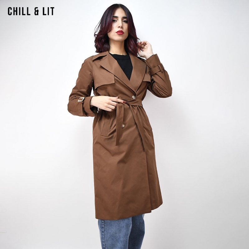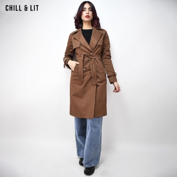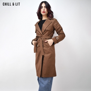 Trench Long avec Col Revers, Manches Longues, Ajustables avec Ceinture de la Même Tissu et Boutons. Poches sur le devant. Fermeture Croisée par Boutons sur le devant Hyper Tendance Cet Hiver. Le Mannequin Porte La Taille S.