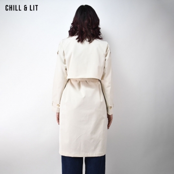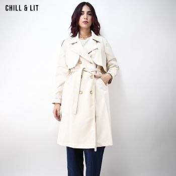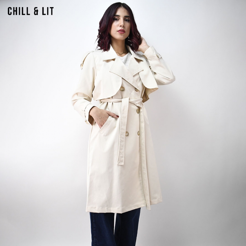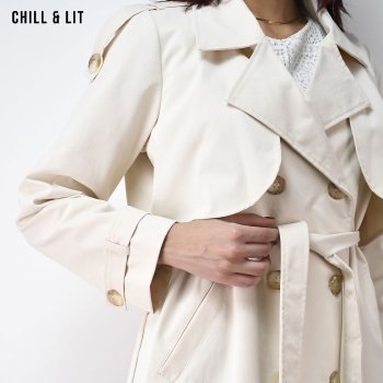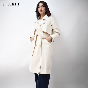 Trench Long avec Col Revers, Manches Longues, Ajustables avec Ceinture de la Même Tissu et Boutons. Poches sur le devant. Fermeture Croisée par Boutons sur le devant Hyper Tendance Cet Hiver. Le Mannequin Porte La Taille 40.