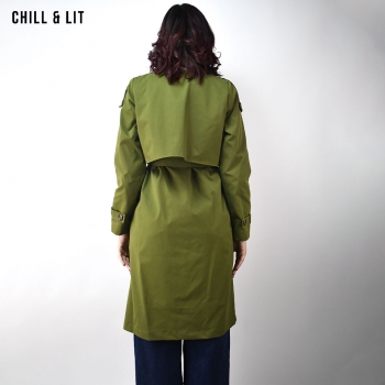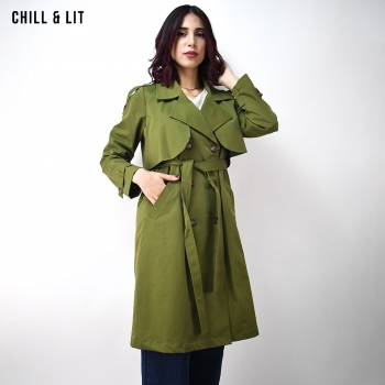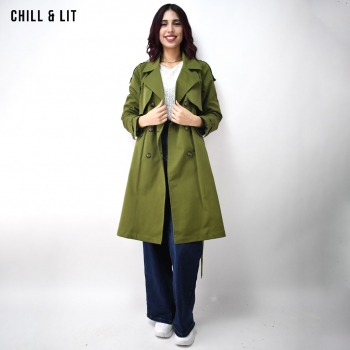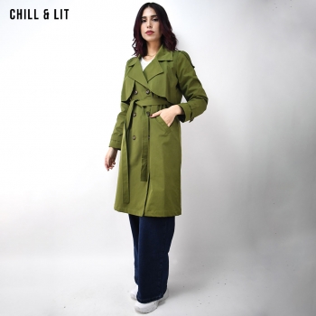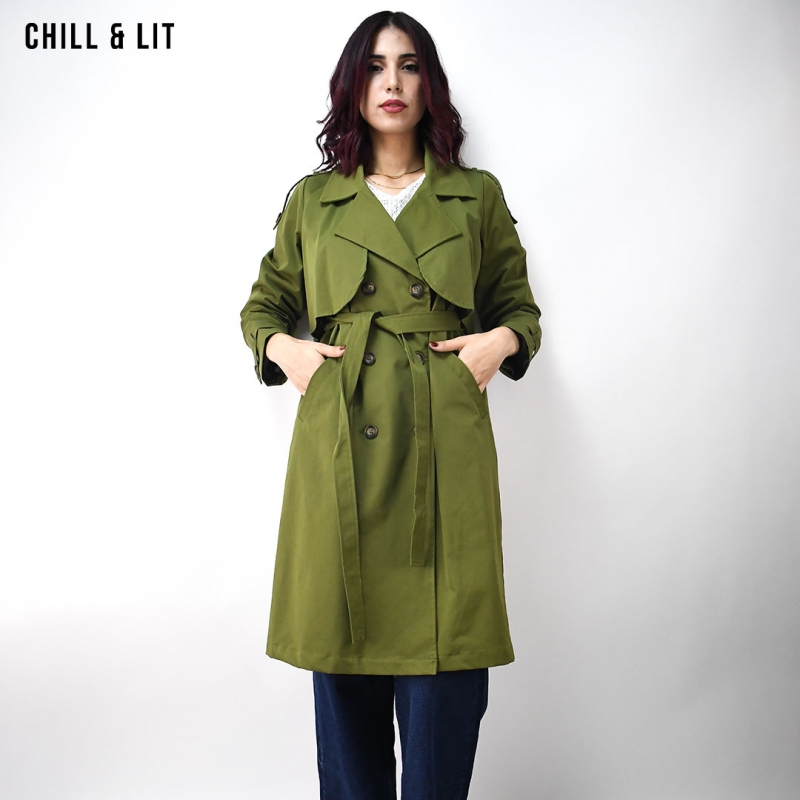 Trench Long avec Col Revers, Manches Longues, Ajustables avec Ceinture de la Même Tissu et Boutons. Poches sur le devant. Fermeture Croisée par Boutons sur le devant Hyper Tendance Cet Hiver. Le Mannequin Porte La Taille 40.