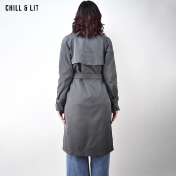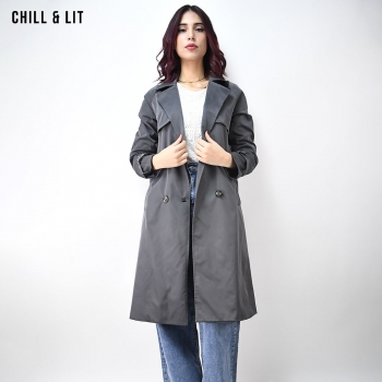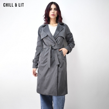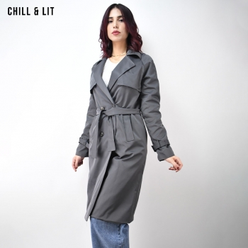 Trench Long avec Col Revers, Manches Longues, Ajustables avec Ceinture de la Même Tissu et Boutons. Poches sur le devant. Fermeture Croisée par Boutons sur le devant Hyper Tendance Cet Hiver. Le Mannequin Porte La Taille S.