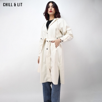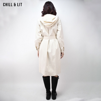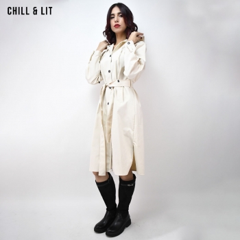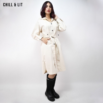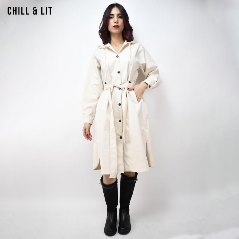 Trench Long avec Capuche et des Manches Longues, Ajustables avec Ceinture de la Même Tissu et Boutons. Poches sur le devant. Fermeture par Boutons sur le devant Hyper Tendance Cet Hiver. Le Mannequin Porte La Taille 40.