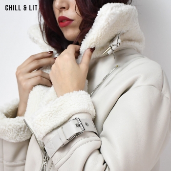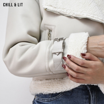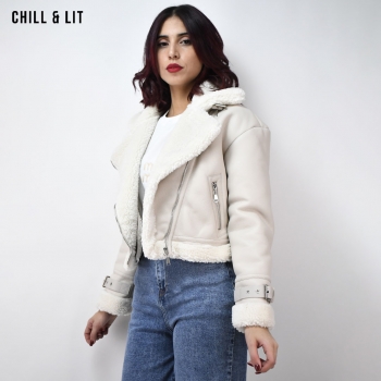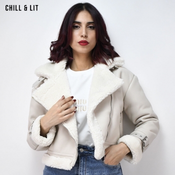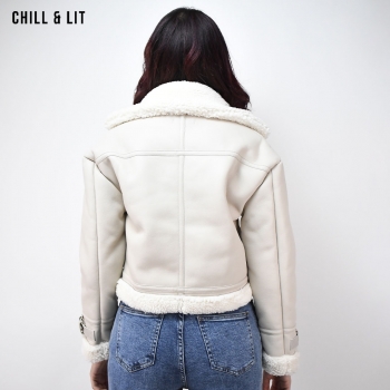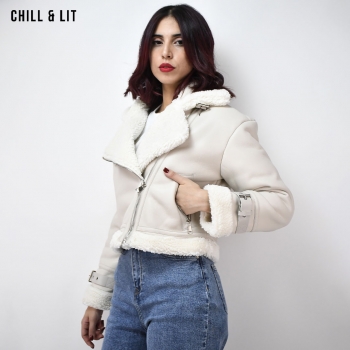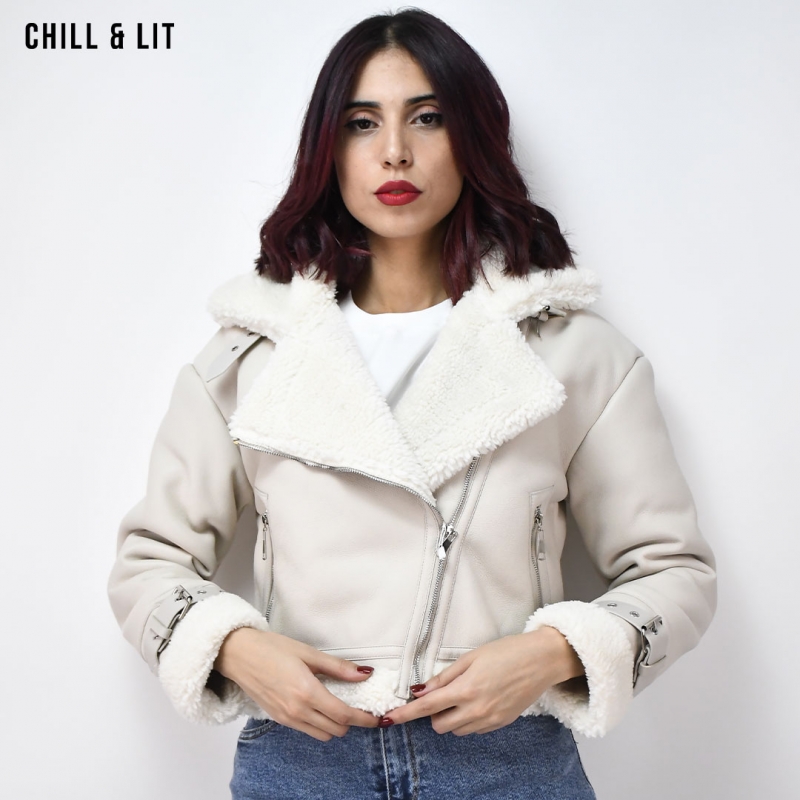 Veste Cuir Femme avec Doublure ,Fermeture Glissière Croisée et Col en Fausse Forure Hyper Tendance cet Hiver. Le Mannequin Porte La Taille XS et Mesure 1m78.