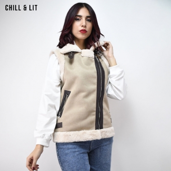 Veste Daim Femme avec Doublure Avec Fermeture Glissière Croisée et Col en Fausse Forure Hyper Tendance cet Hiver. Le Mannequin Porte La Taille XS et Mesure 1m78.