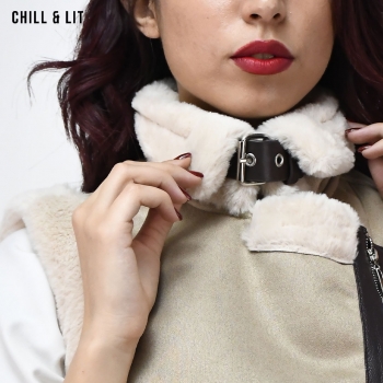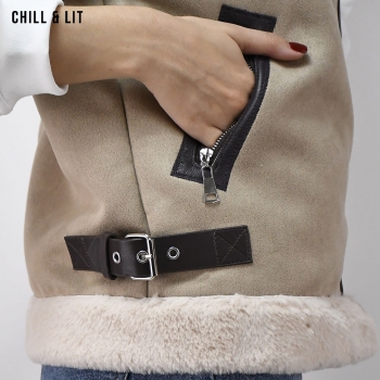 Veste Daim Femme avec Doublure Avec Fermeture Glissière Croisée et Col en Fausse Forure Hyper Tendance cet Hiver. Le Mannequin Porte La Taille XS et Mesure 1m78.
