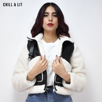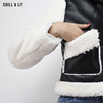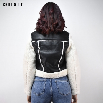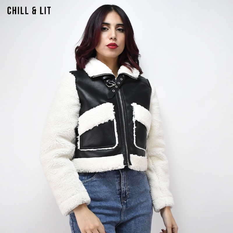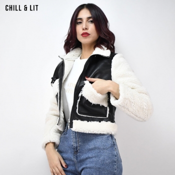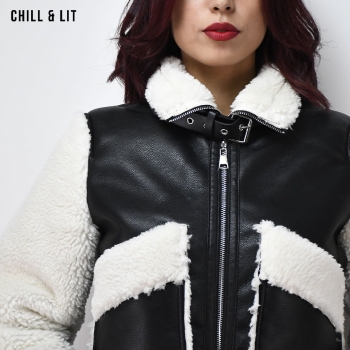 Veste Cuir Femme avec Doublure ,Fermeture Glissière Croisée et Col en Fausse Forure Hyper Tendance cet Hiver. Le Mannequin Porte La Taille XS et Mesure 1m78.