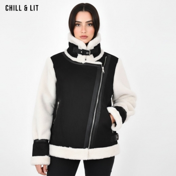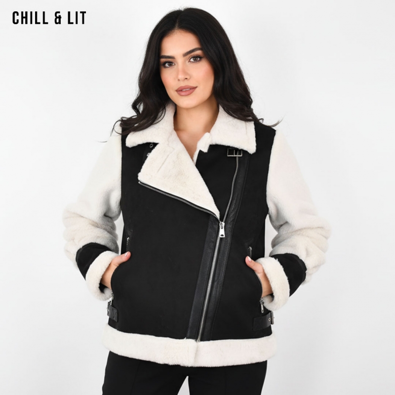 Veste Daim Femme avec Doublure ,Fermeture Glissière Croisée et Col en Fausse Forure Hyper Tendance cet Hiver. Le Mannequin Porte La Taille S et Mesure 1m78.