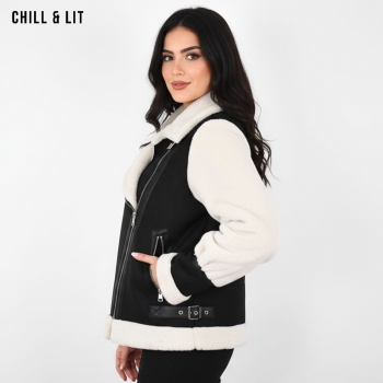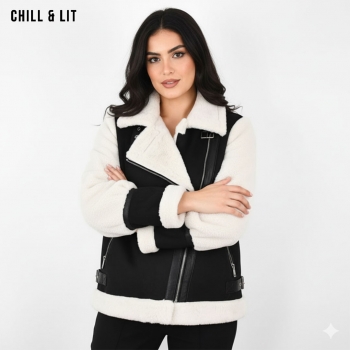Veste Cuir Femme avec Doublure ,Fermeture Glissière Croisée et Col en Fausse Forure Hyper Tendance cet Hiver. Le Mannequin Porte La Taille S et Mesure 1m78.
