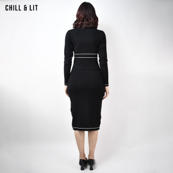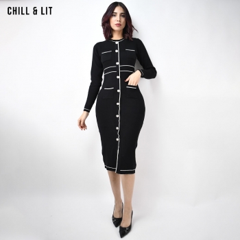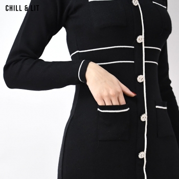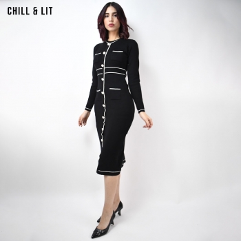 Robe Longue pour Femme , Avec Manches Longues et Col Rond avec Boutons Inoxydables Hyper Tendances . Le Mannequin Porte La Taille Standard.
