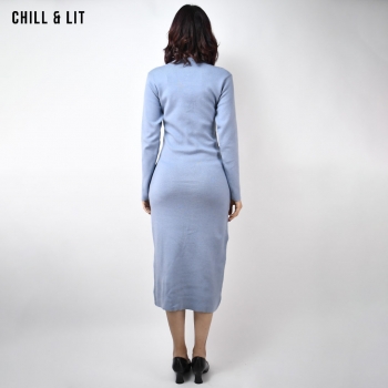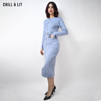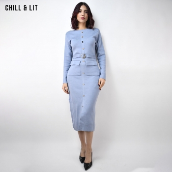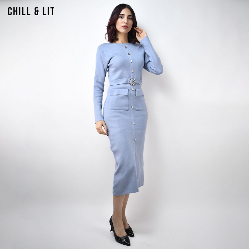 Robe Longue pour Femme , Avec Manches Longues et Col Rond avec Boutons Inoxydables Hyper Tendances . Le Mannequin Porte La Taille Standard.