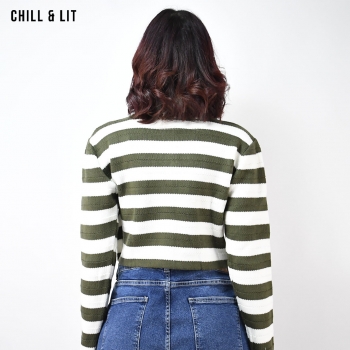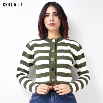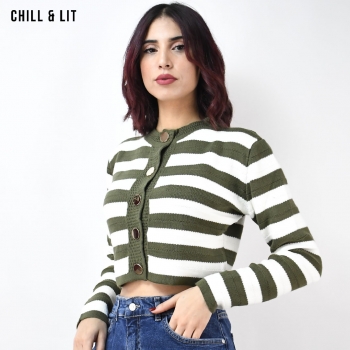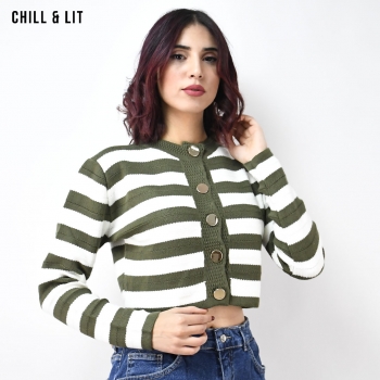 Gilet Court Rayé en Laine pour Femme , Manches Longues avec Boutons Inoxydables. Hyper Tendance. Mannequin Porte La Taille Standard.