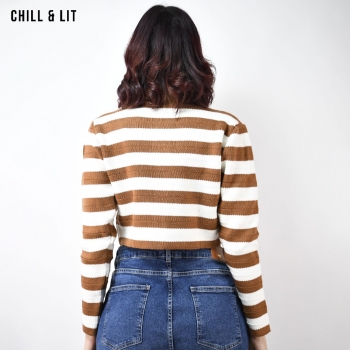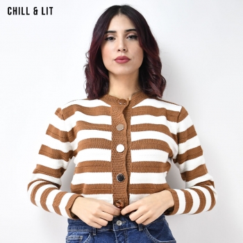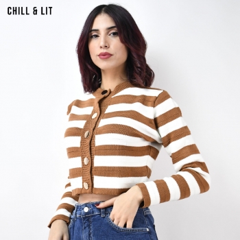 Gilet Court Rayé en Laine pour Femme , Manches Longues avec Boutons Inoxydables. Hyper Tendance. Mannequin Porte La Taille Standard.