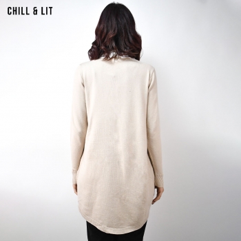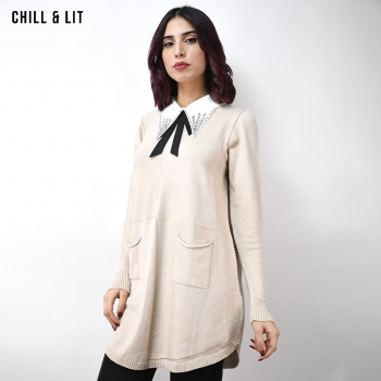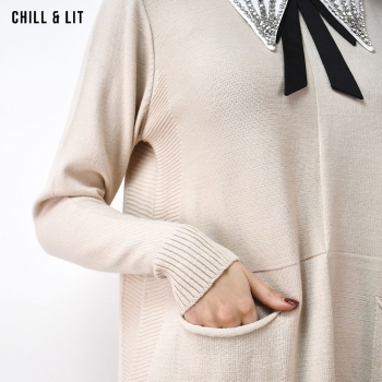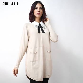 Pull Laine Long Femme , Avec Manches Longues, Deux Poches à l'avant et Col chemise à Strass . Hyper Tendances . Le Mannequin Porte La Taille Standard.