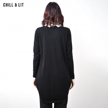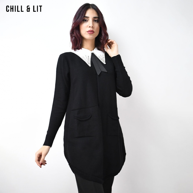 Pull Laine Long Femme , Avec Manches Longues, Deux Poches à l'avant et Col chemise à Strass . Hyper Tendances . Le Mannequin Porte La Taille Standard.