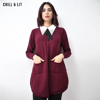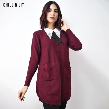 Pull Laine Long Femme , Avec Manches Longues, Deux Poches à l'avant et Col chemise à Strass . Hyper Tendances . Le Mannequin Porte La Taille Standard.