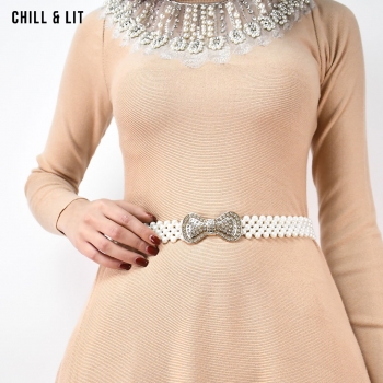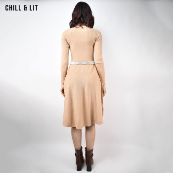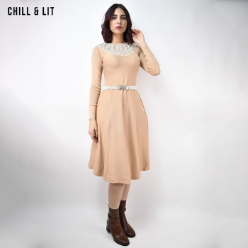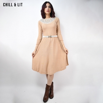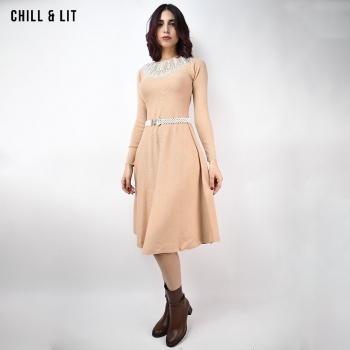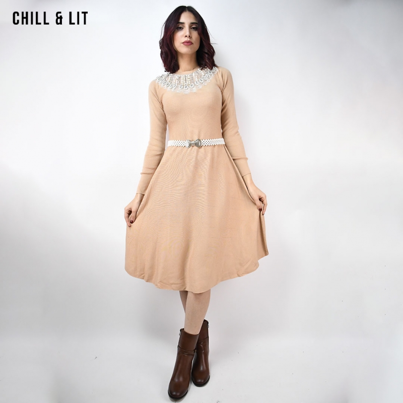 Robe de Soirée Femme mi-Longue, Manches Longues, Col Rond, avec Ceinture Ornée de Perles. Hyper Tendances cet été. Le Mannequin Porte La Taille Standard.