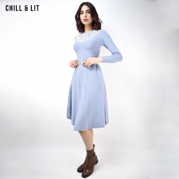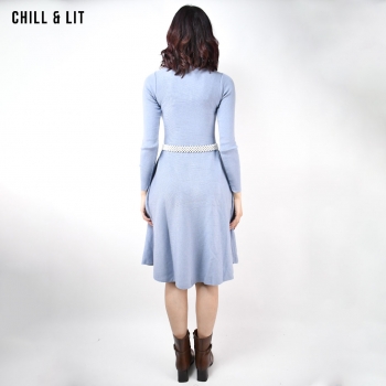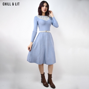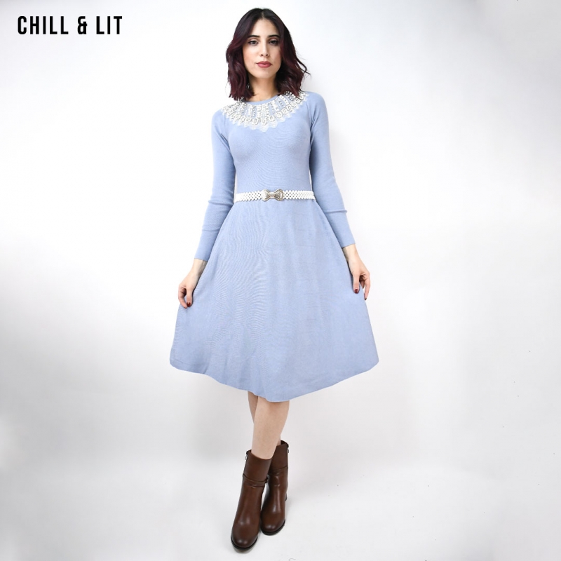 Robe de Soirée Femme mi-Longue, Manches Longues, Col Rond, avec Ceinture Ornée de Perles. Hyper Tendances cet été. Le Mannequin Porte La Taille Standard.