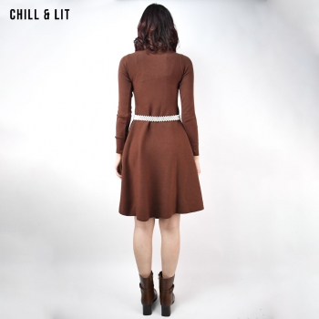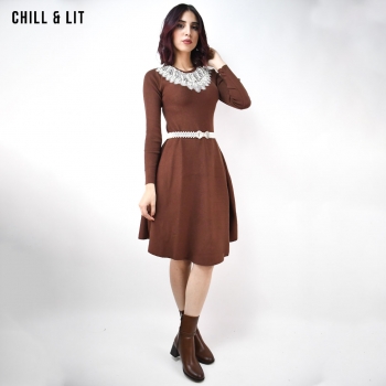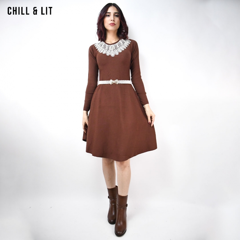 Robe de Soirée Femme mi-Longue, Manches Longues, Col Rond, avec Ceinture Ornée de Perles. Hyper Tendances cet été. Le Mannequin Porte La Taille Standard.