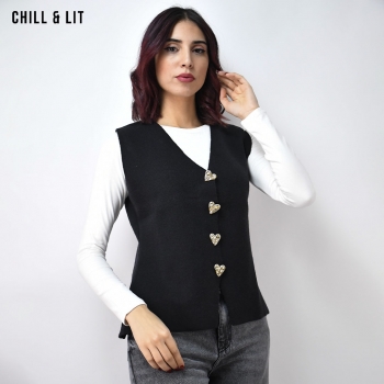Gilet en Laine pour Femme, sans Manches, avec Boutons en Forme de Cœur en Acier Inoxydable. Hyper Tendance Cet Hiver . Mannequin Porte La Taille Standard .