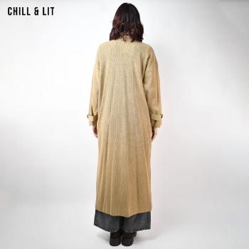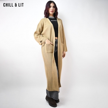 Gilet Long en Laine pour Femme avec Manches Longues et deux poches. Super Tendance cet Hiver. Le Mannequin Porte La Taille Standard et Mesure 1m78.